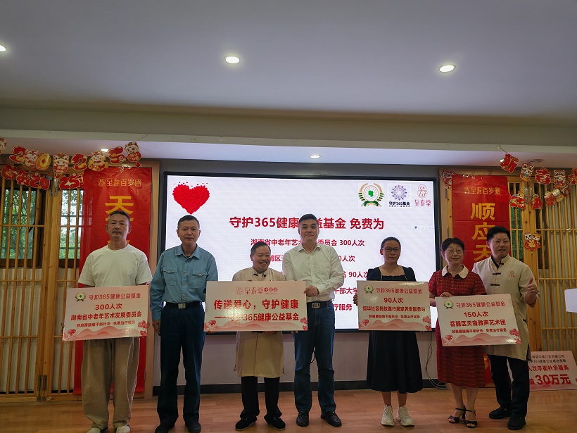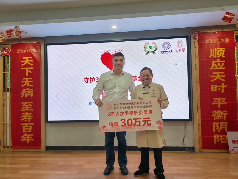 活动现场,长沙至寿堂中医门诊有限公司向守护365健康公益基金捐赠价值30万元的"平衡针灸"诊疗服务,计划覆盖3000人次。服务内容包含: 应用国家973项目技术缓解颈肩腰腿痛;针灸、三伏贴预约及气血/血压/血糖检测;八段锦功法现场教学;香囊制作、艾制品应用等互动项目。