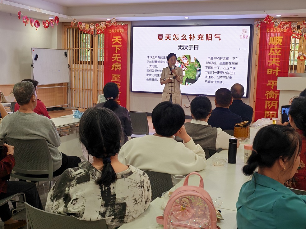 至寿堂中医博士杨蓉进行"夏季扶阳养生"专题宣讲,结合《黄帝内经》养生智慧,提出"三要三不要"原则,要:适度日照吸收阳气、饮食清淡健脾祛湿、静心安神调和阴阳;忌:过度贪凉、暴饮暴食、情绪躁动;活动现场特设养生茶饮体验区,提供健脾祛湿茶等时令饮品。
